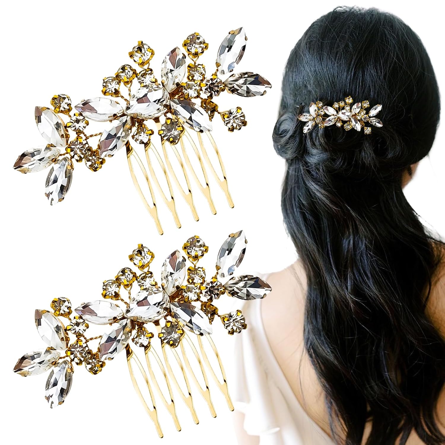 2PCS Gold Rhinestone Clear Crystals Wedding Metal Hair Combs